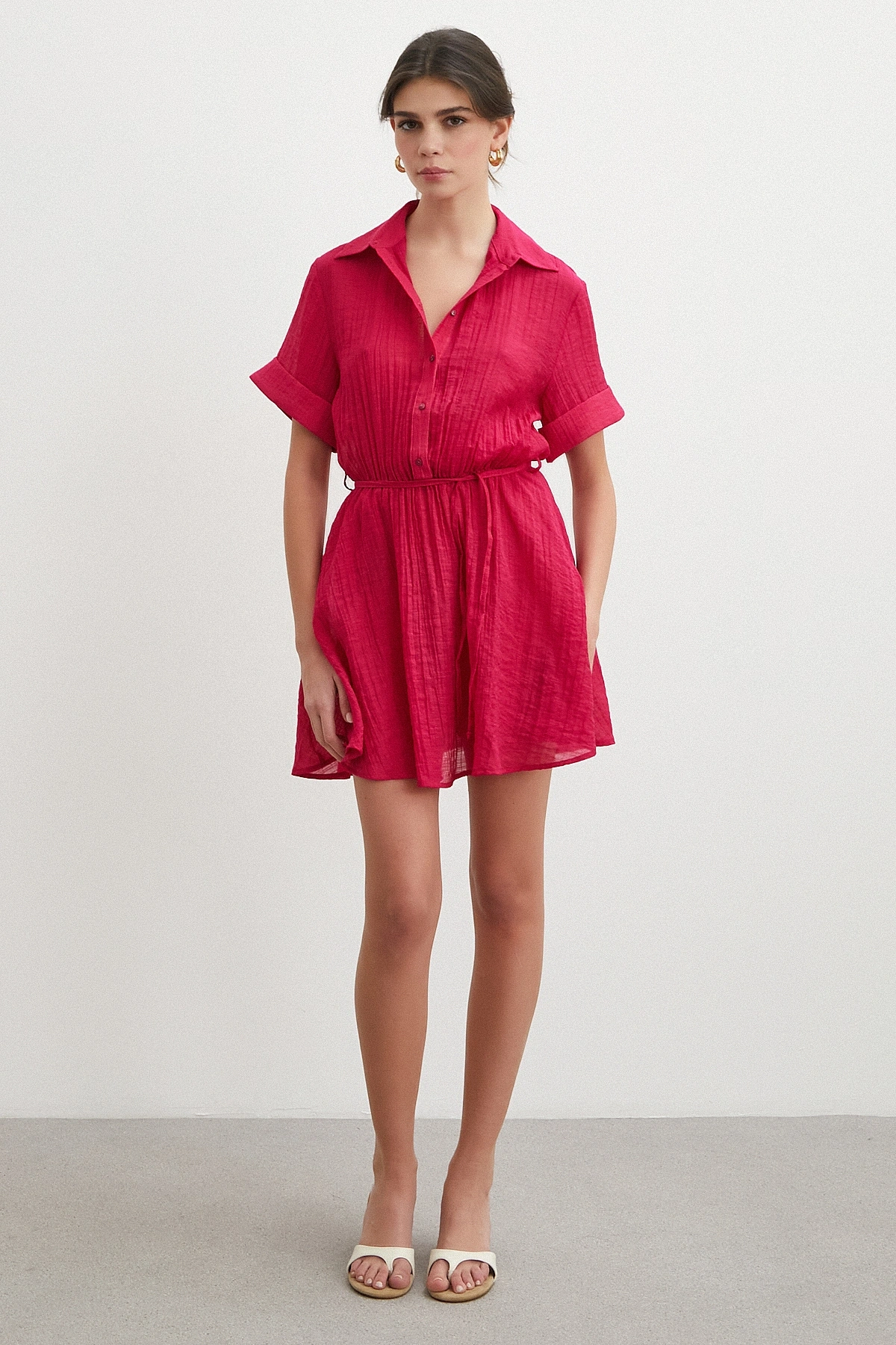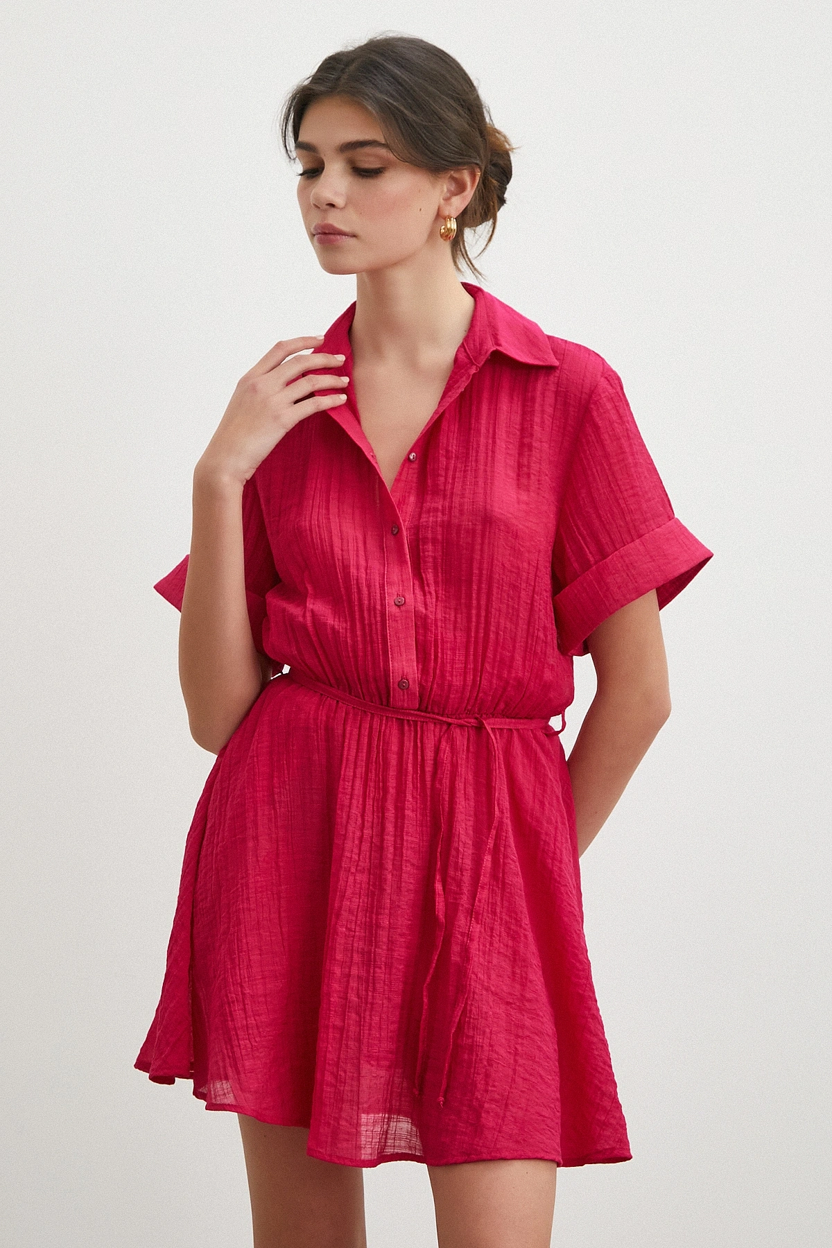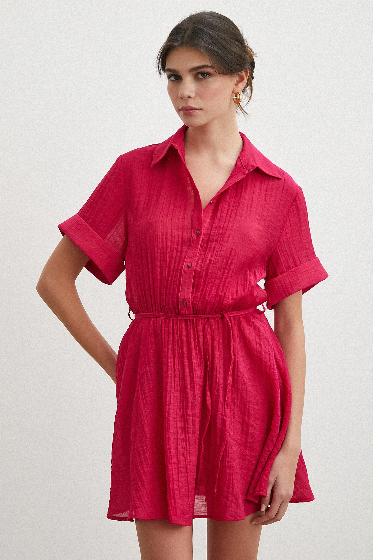Hakim yaka detayı elbiseye sofistike bir duruş katarken, düğmeli kapama pratik kullanım sağlar. Rahat kesimi ve kısa kol boyu ile gün boyu özgürce hareket etmenize olanak tanır.