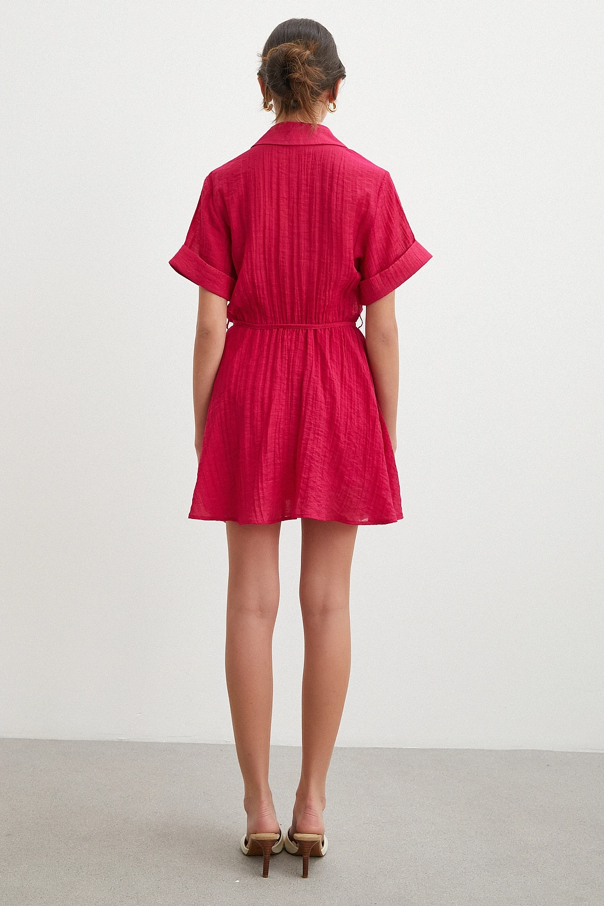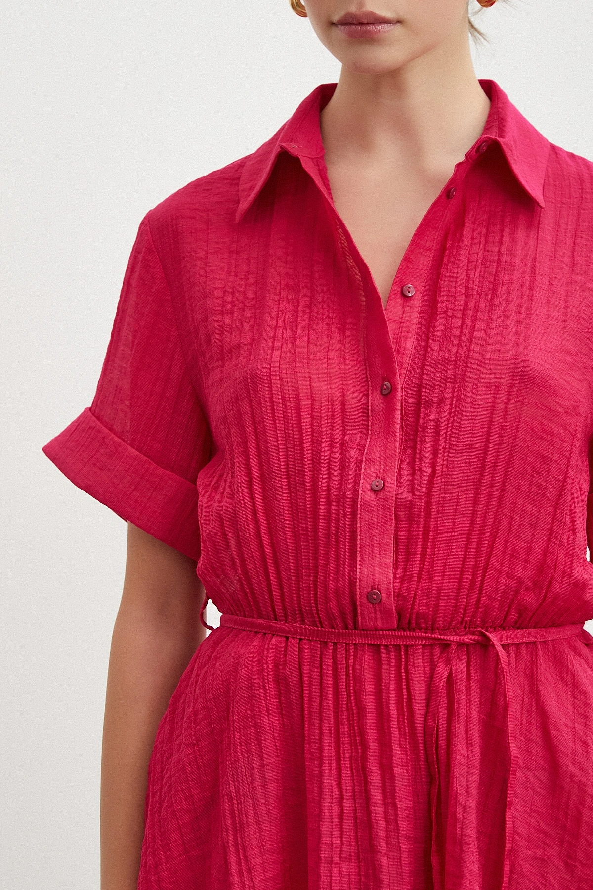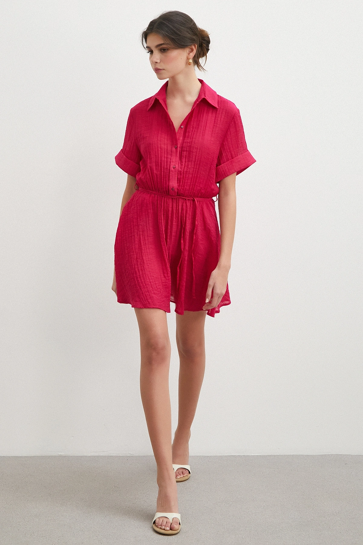 Hakim yaka detayı elbiseye sofistike bir duruş katarken, düğmeli kapama pratik kullanım sağlar. Rahat kesimi ve kısa kol boyu ile gün boyu özgürce hareket etmenize olanak tanır.