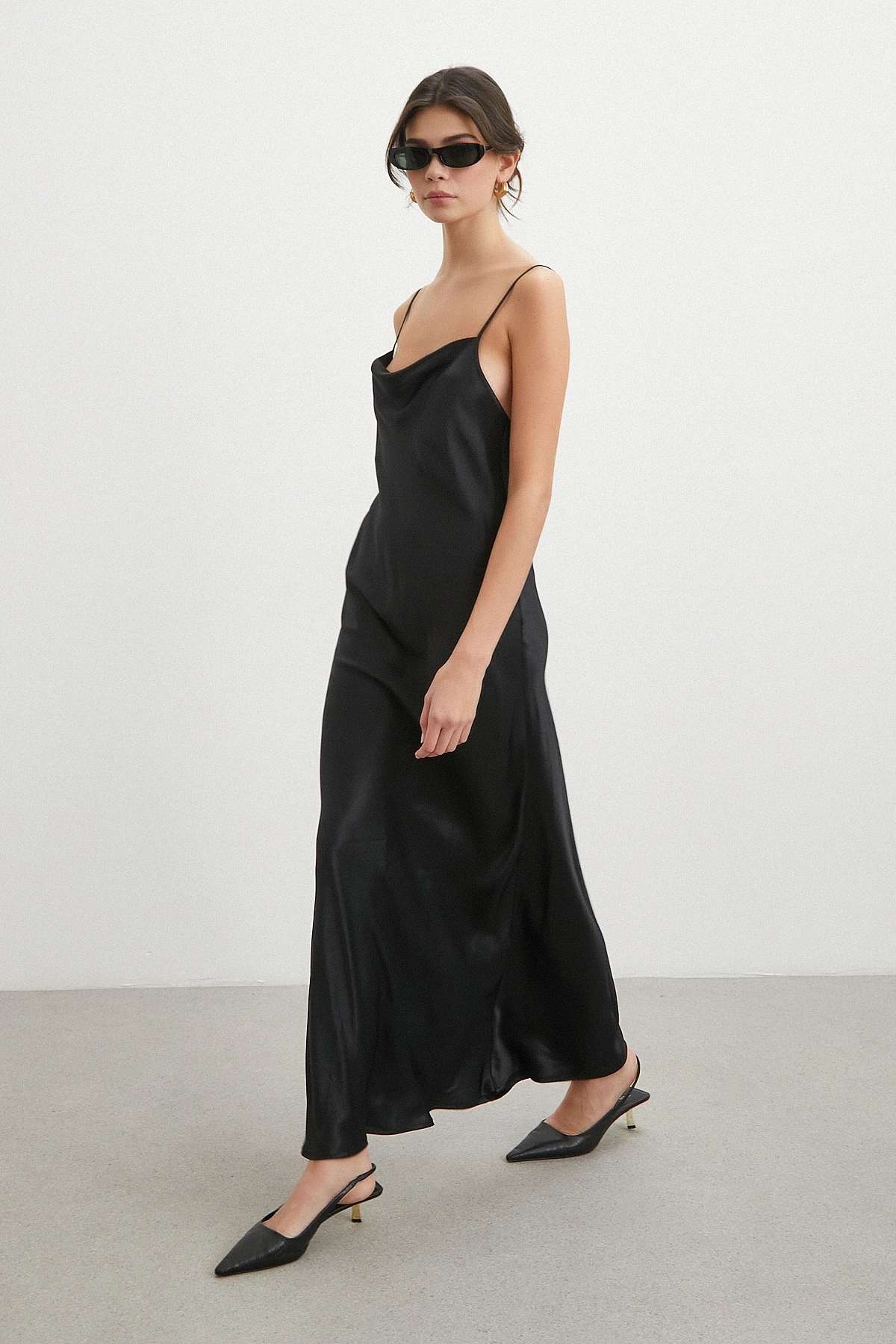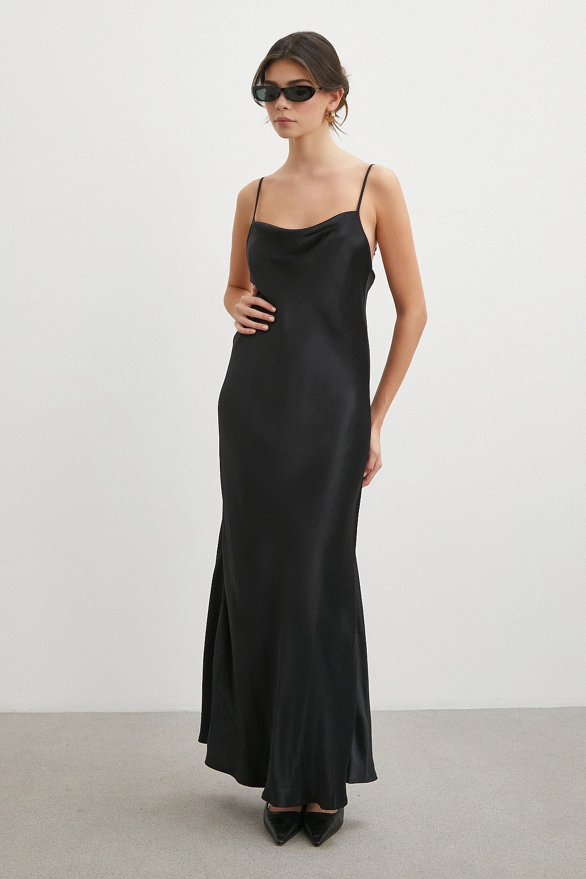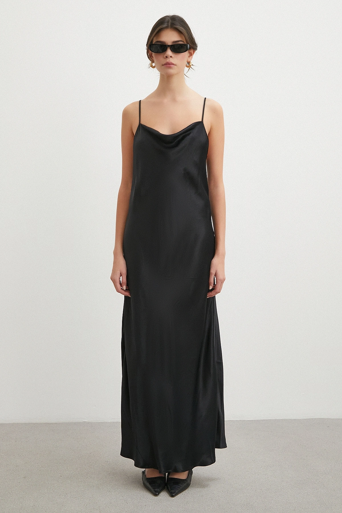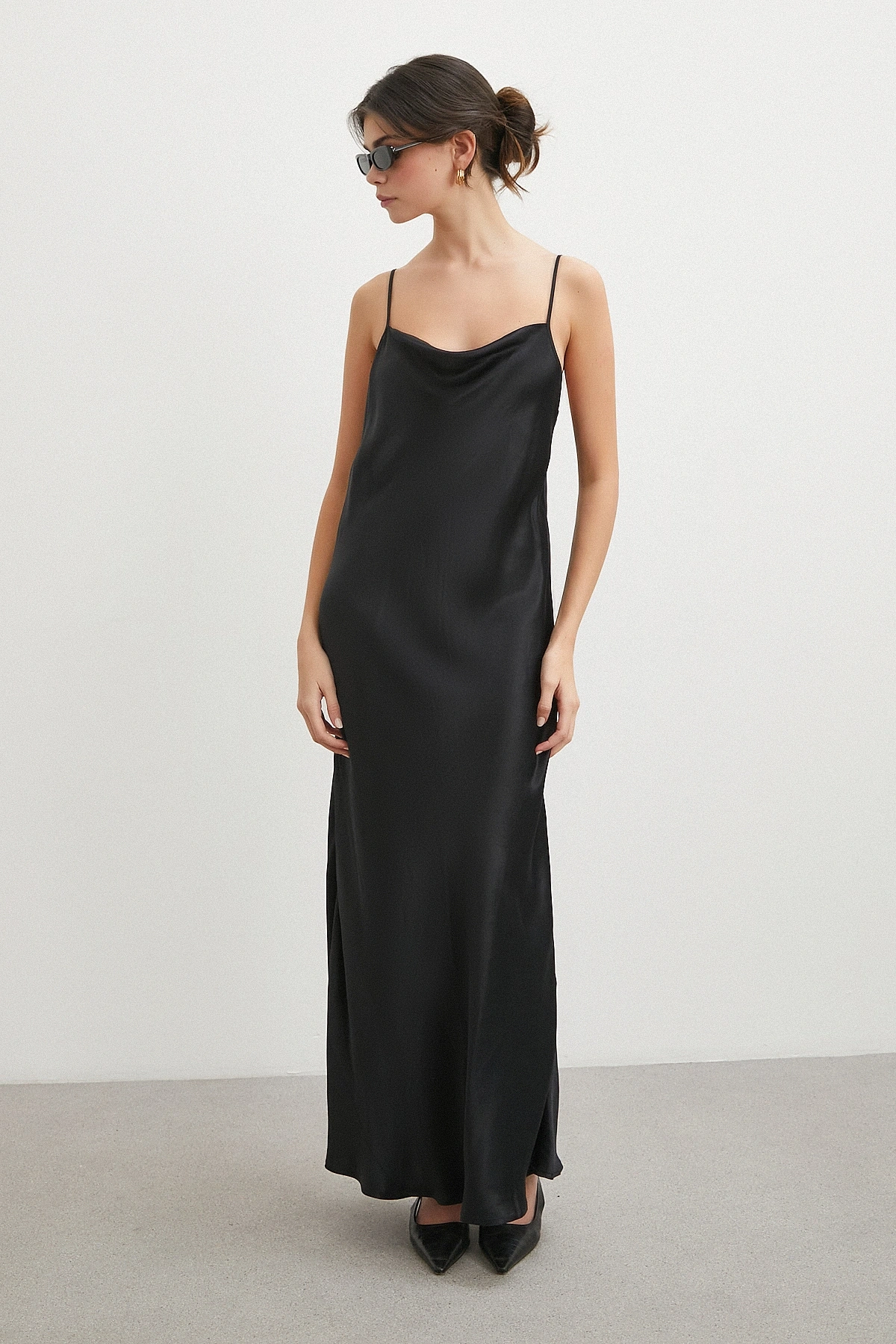 Akıcı saten kumaşıyla feminen ve sofistike bir görünüm sunar. 140 cm maxi boyu ile zarafeti ön plana çıkarırken, ince ve ayarlanabilir askıları sayesinde vücuda mükemmel uyum sağlar.
