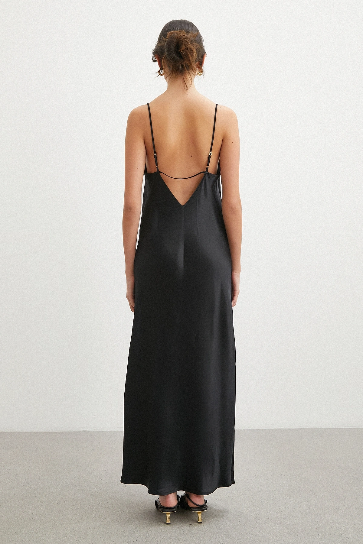 • İnce Askılı Sırt Detaylı Saten Elbise