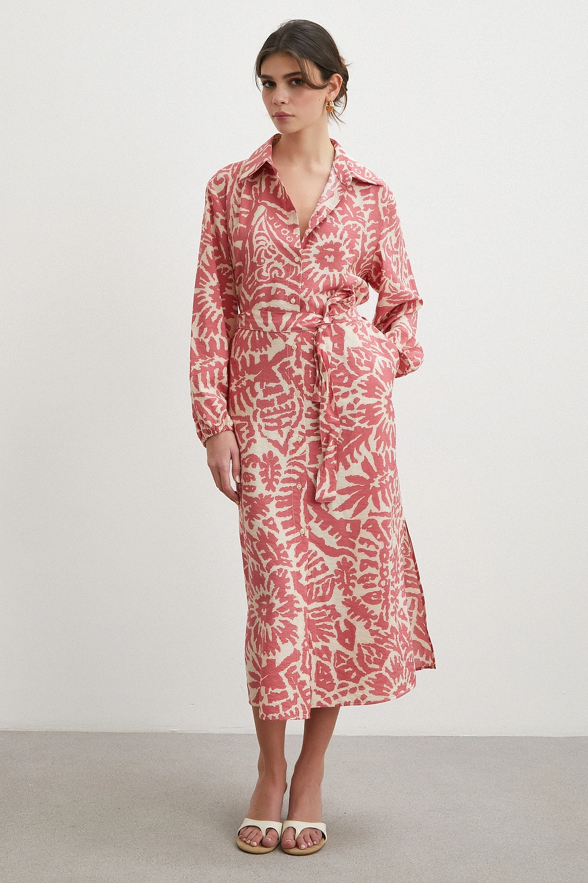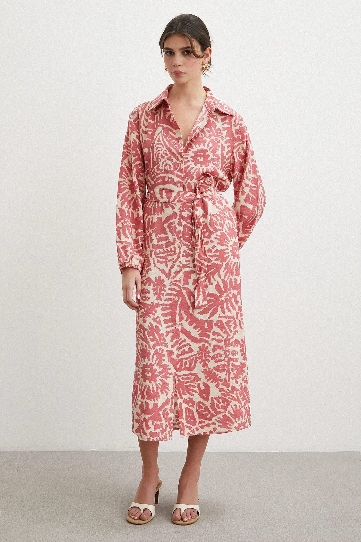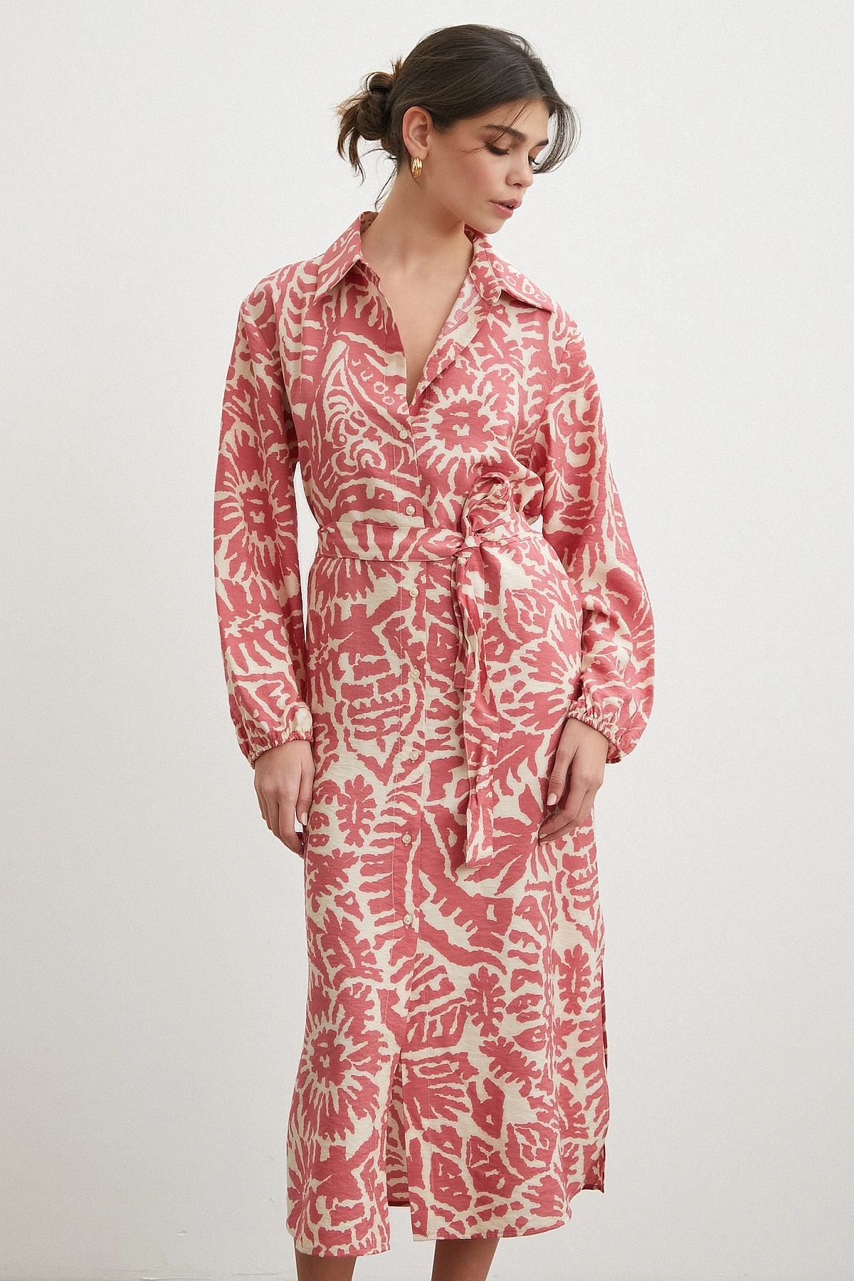 124 cm maxi boyu ile güçlü ve modern bir siluet sunar. Düğmeli kapama detayı klasik gömlek elbise stilini tamamlarken, belden kuşaklı yapısı vücut hatlarını zarifçe vurgular.