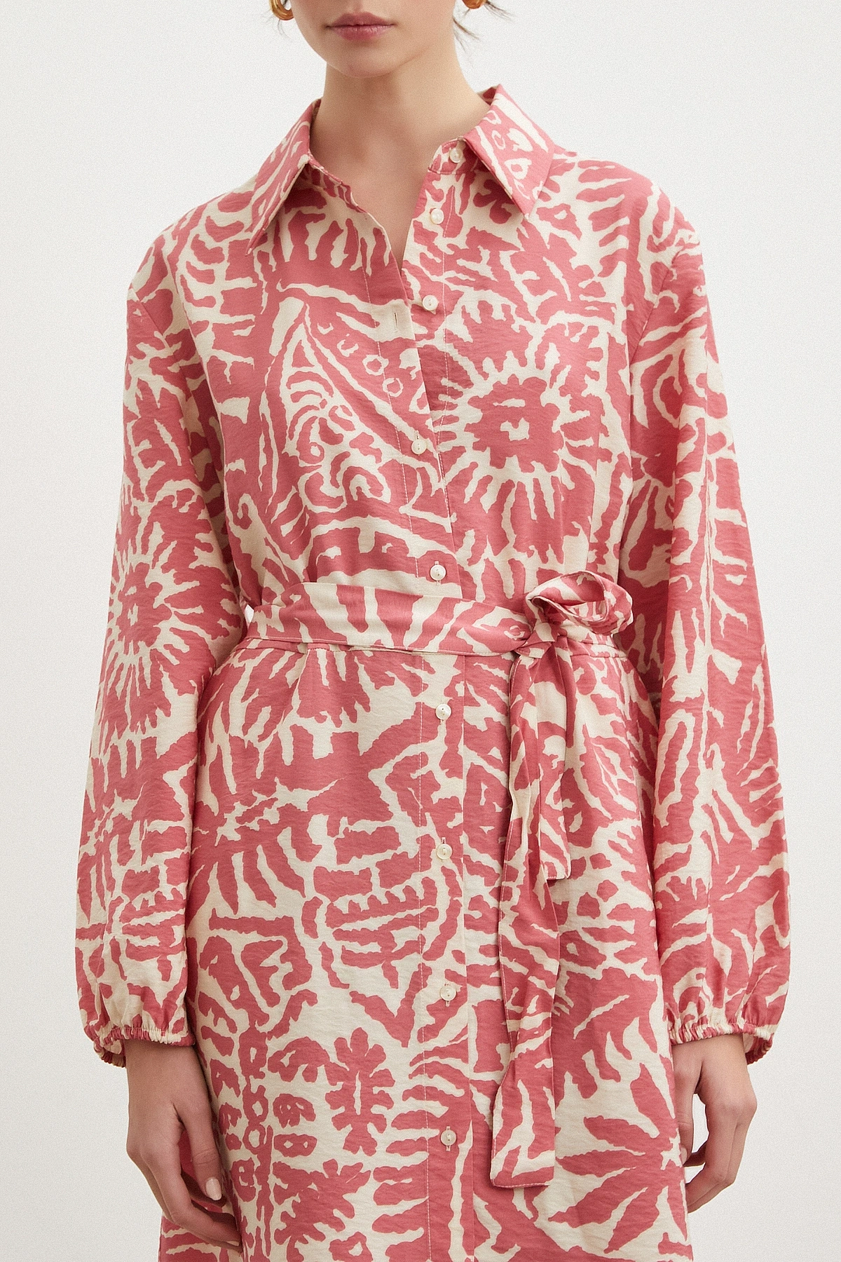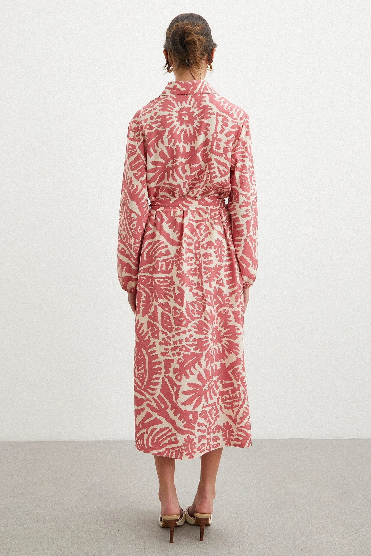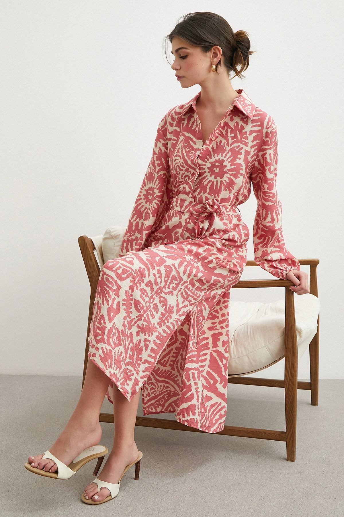 124 cm maxi boyu ile güçlü ve modern bir siluet sunar. Düğmeli kapama detayı klasik gömlek elbise stilini tamamlarken, belden kuşaklı yapısı vücut hatlarını zarifçe vurgular.