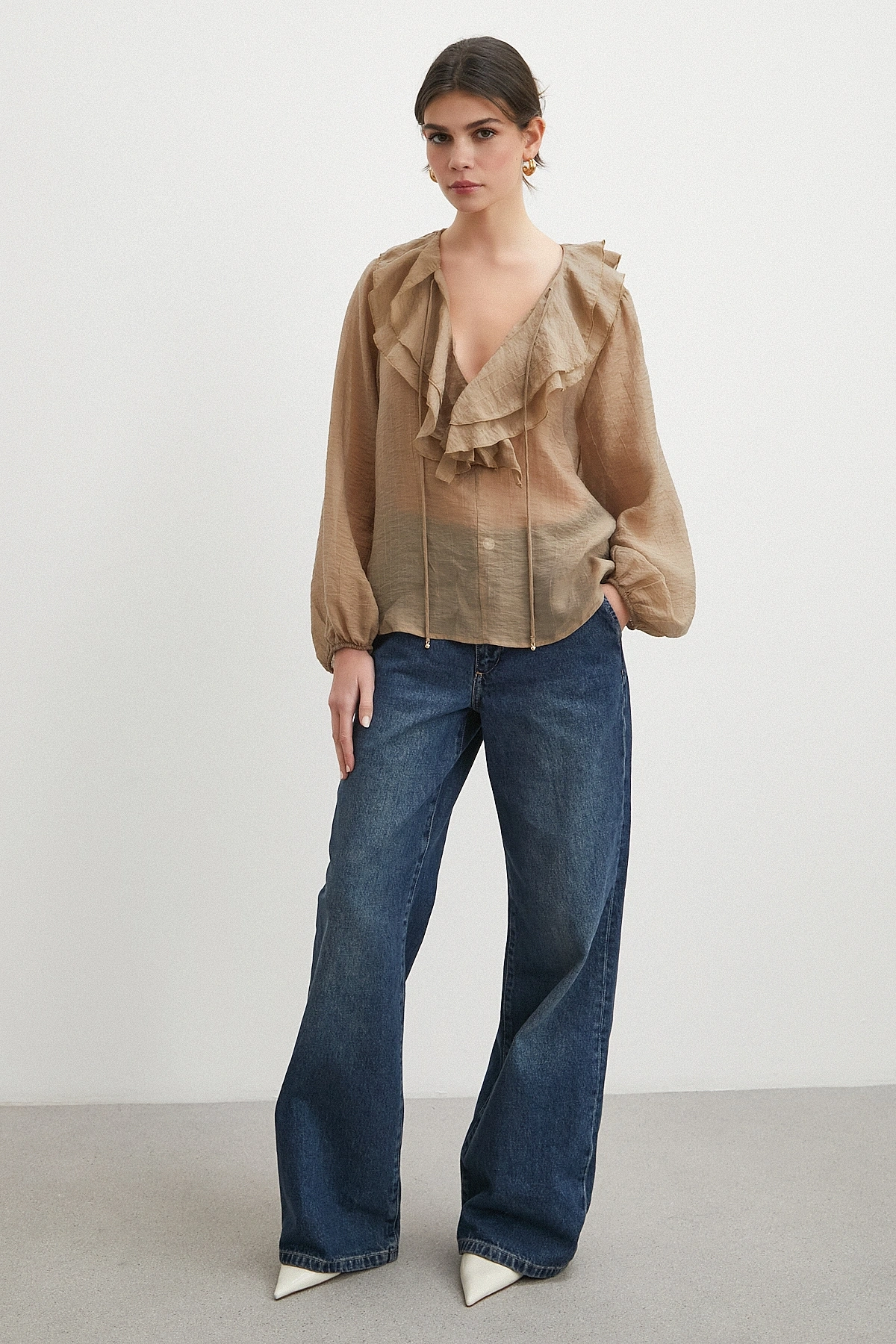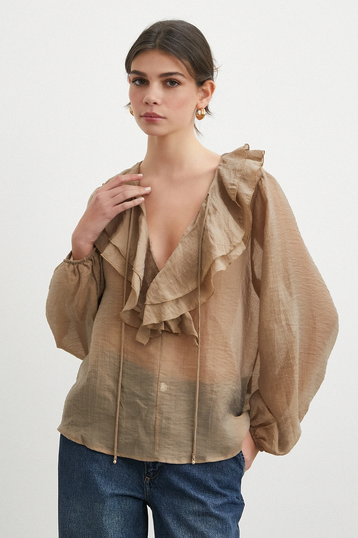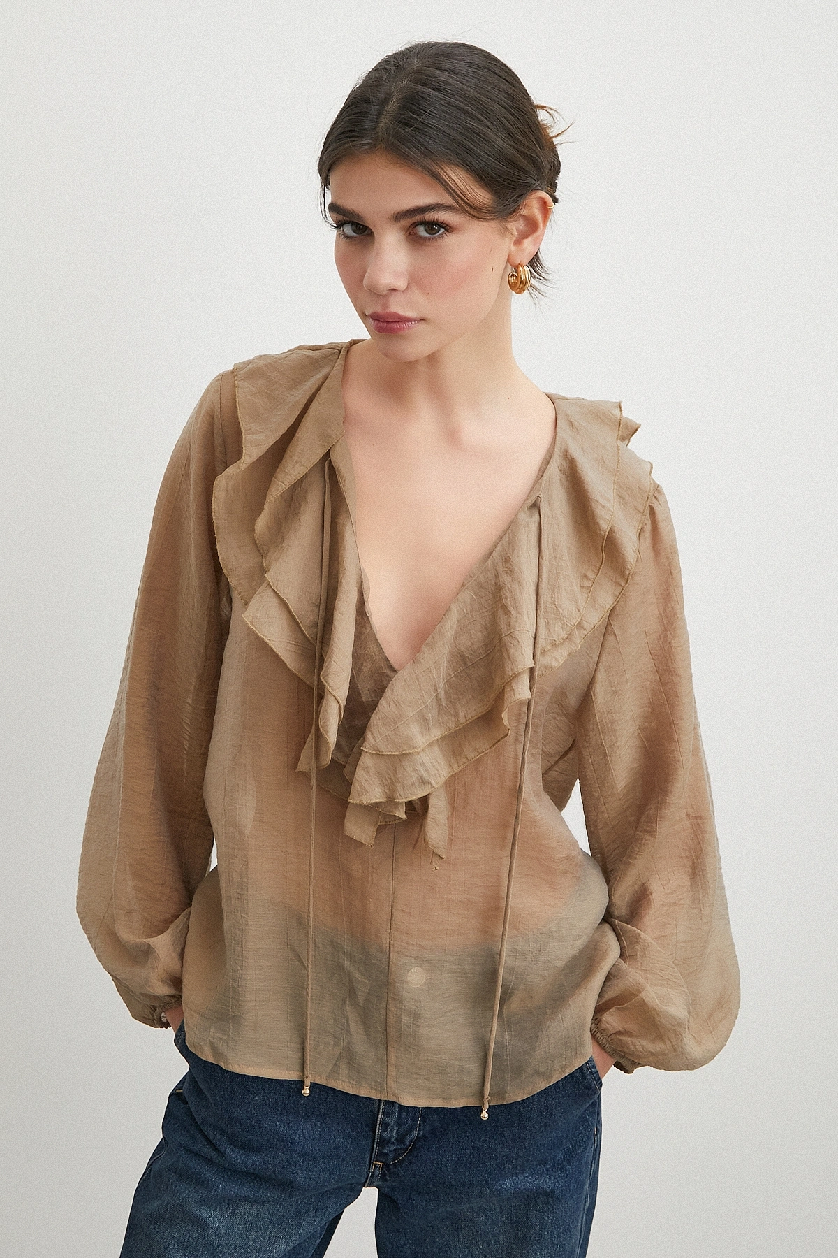 • V Yaka Fırfır Detaylı Bağlamalı Bluz