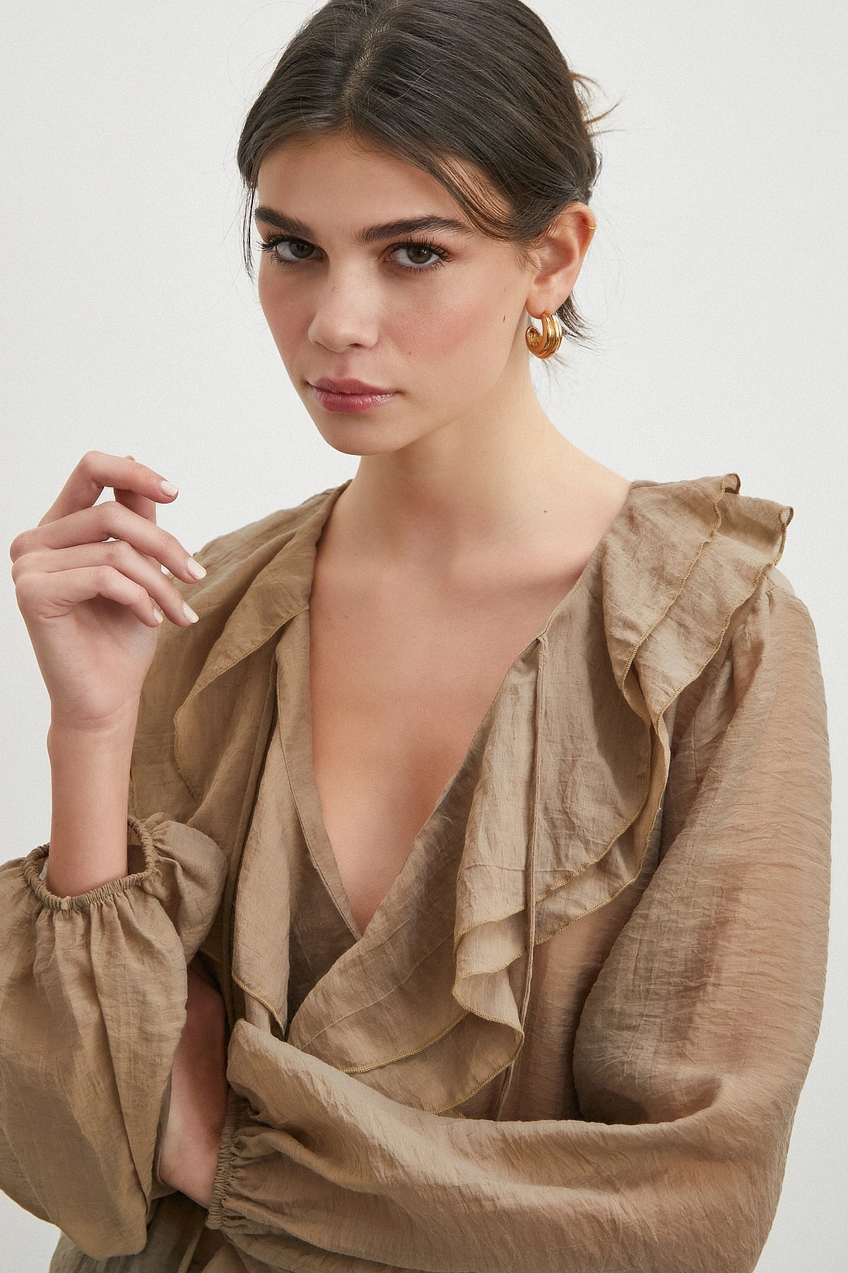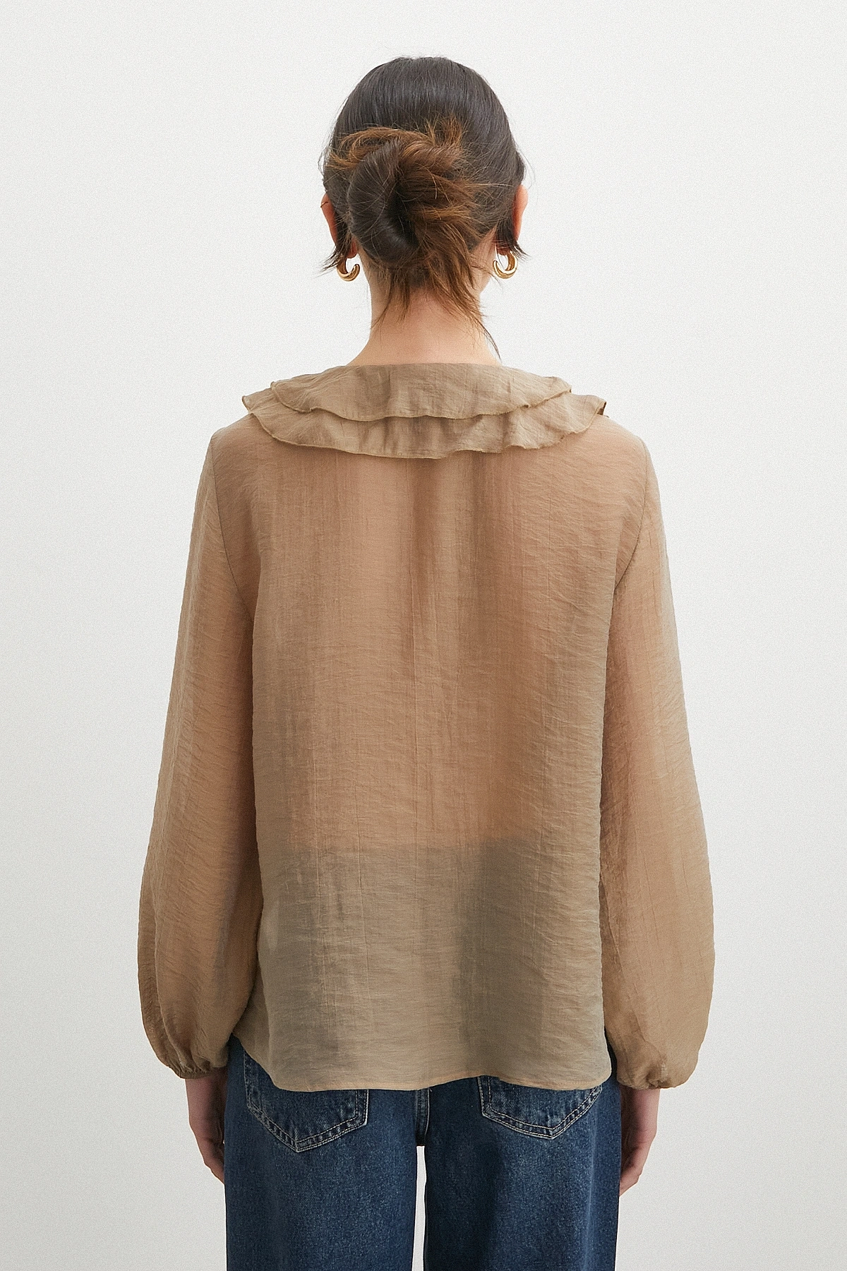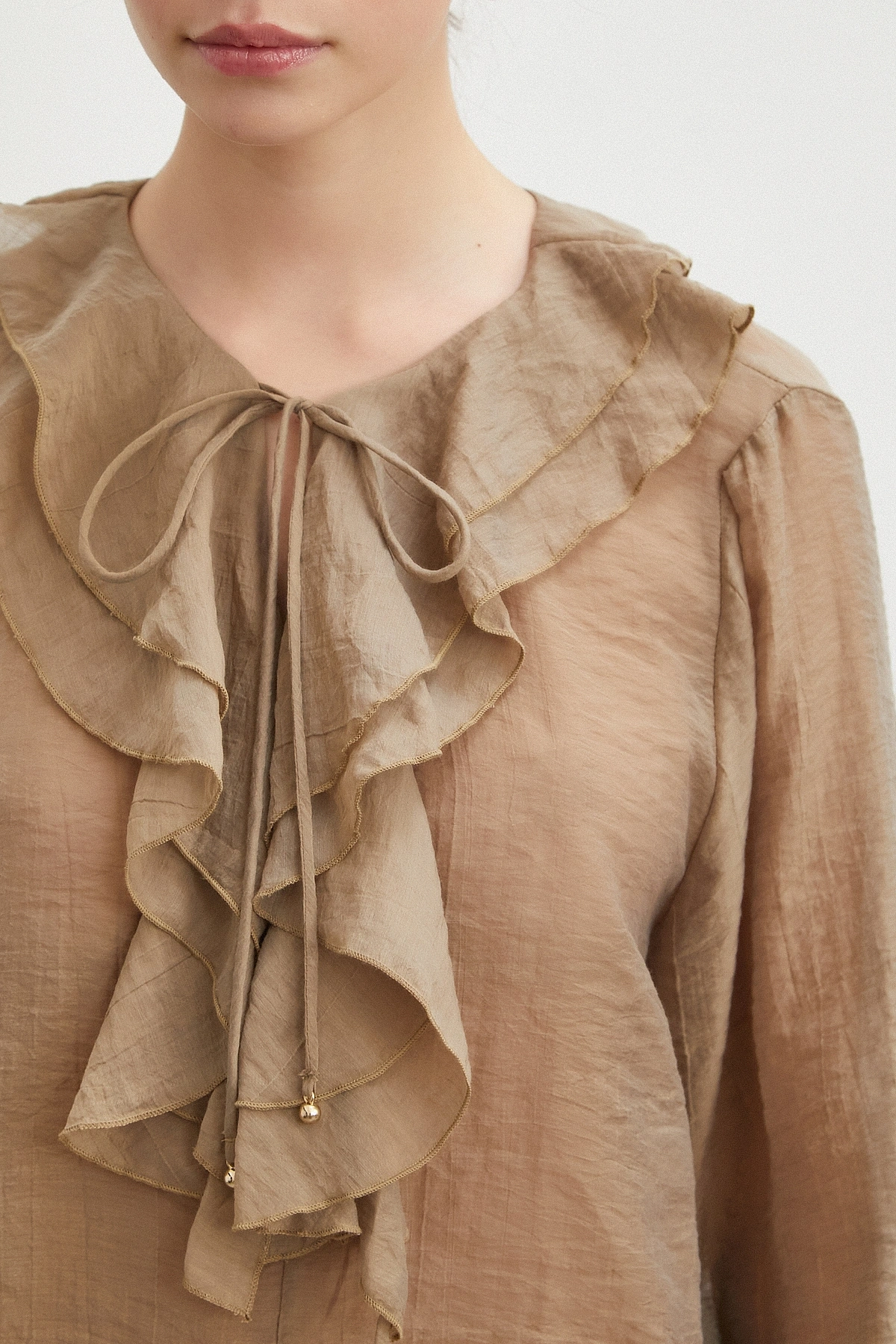 • V Yaka Fırfır Detaylı Bağlamalı Bluz